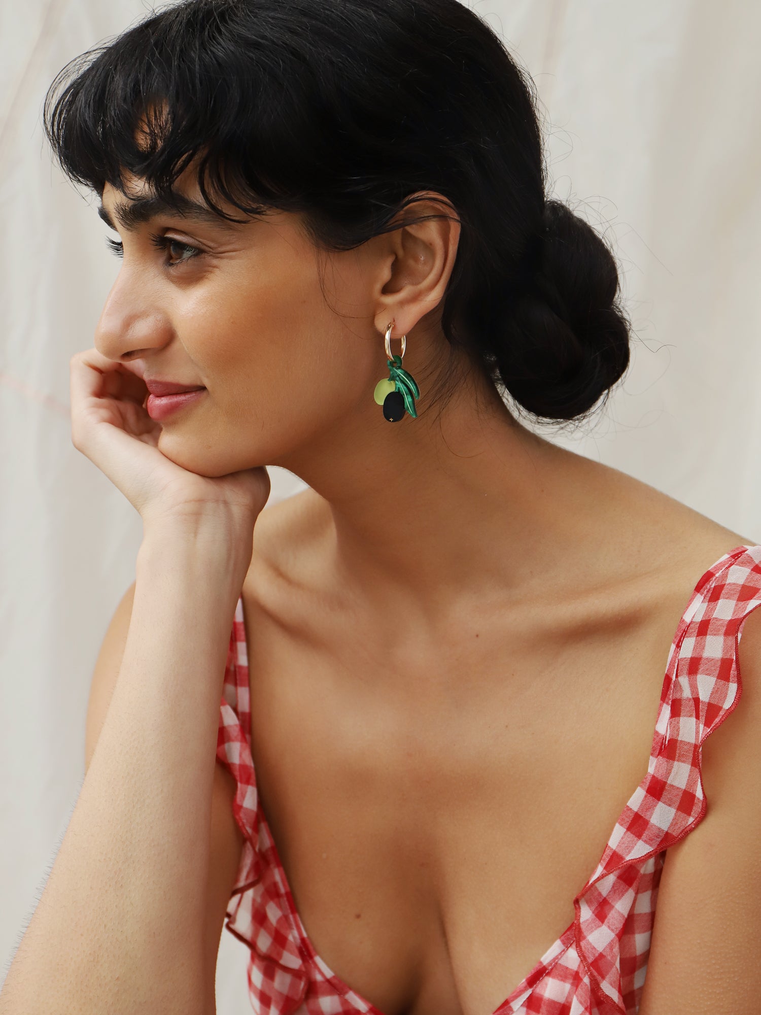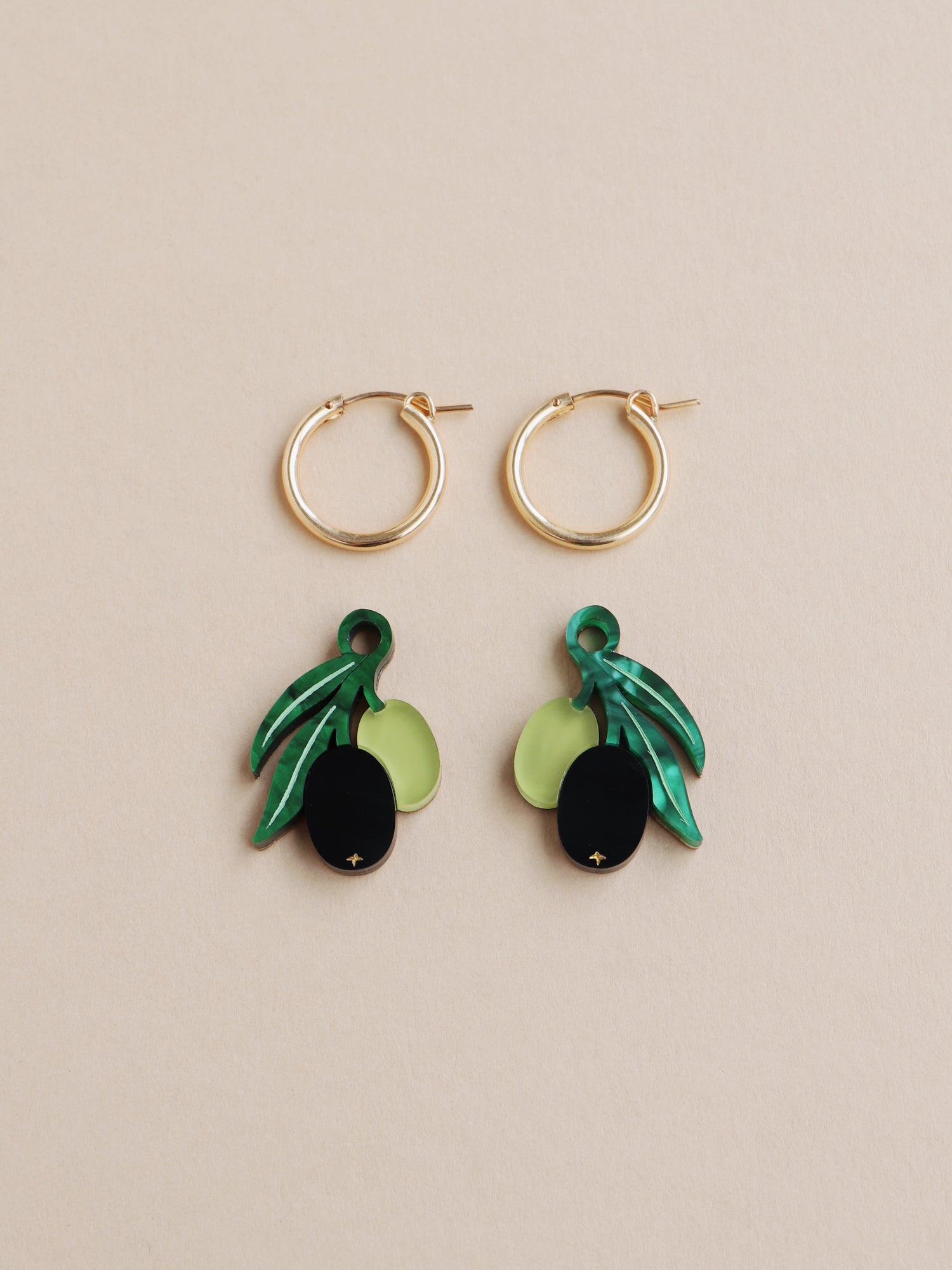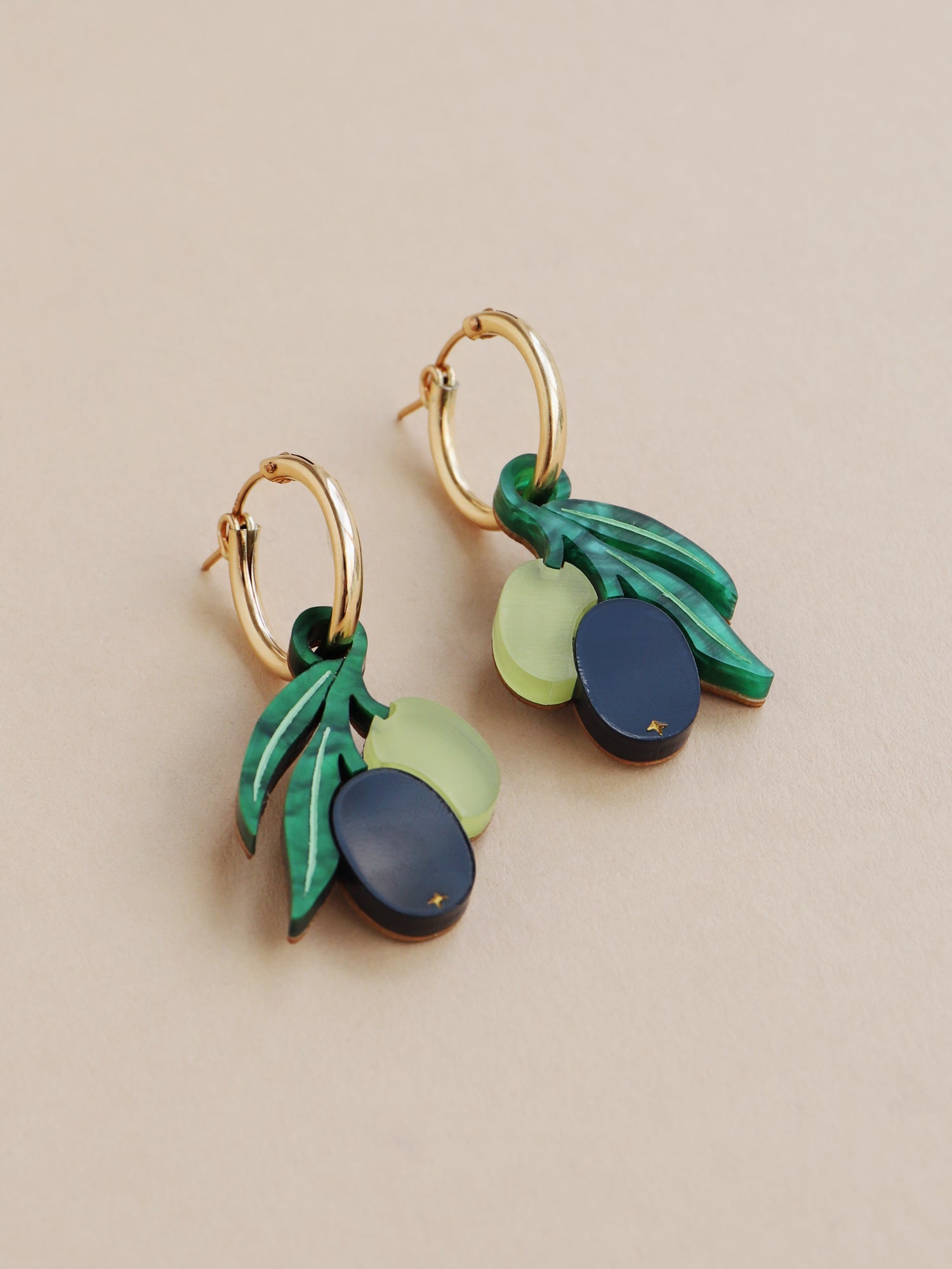 Plucked from the vineyard, our lightweight olive hoop earrings are made from acrylic with hand-inked details.
