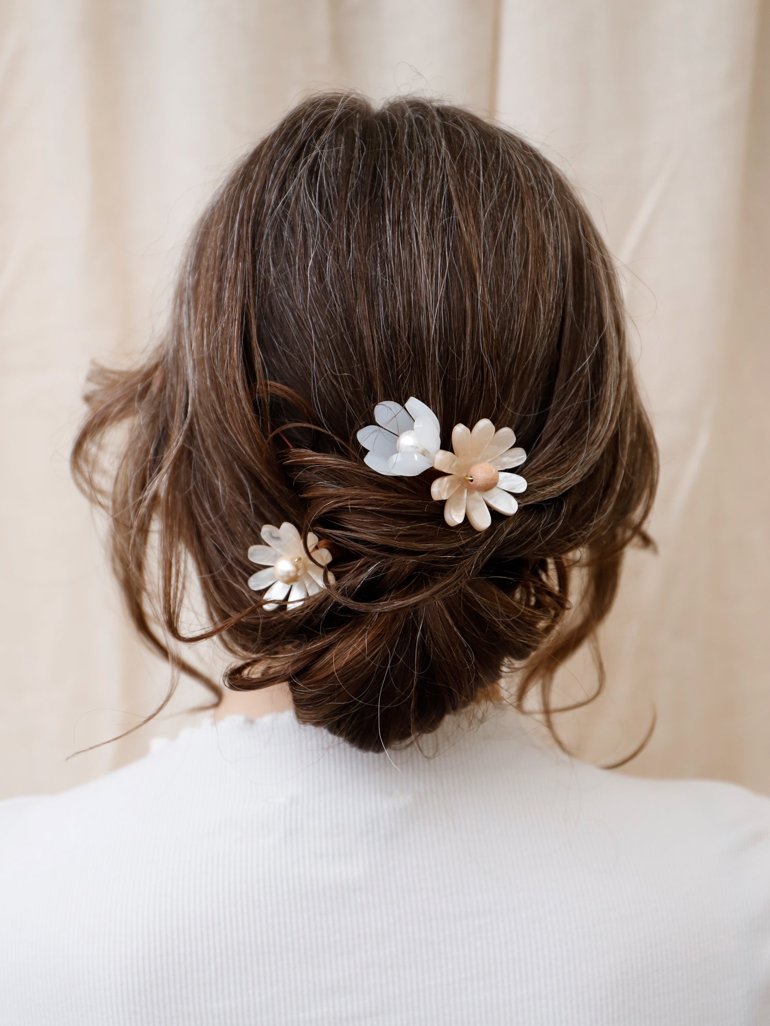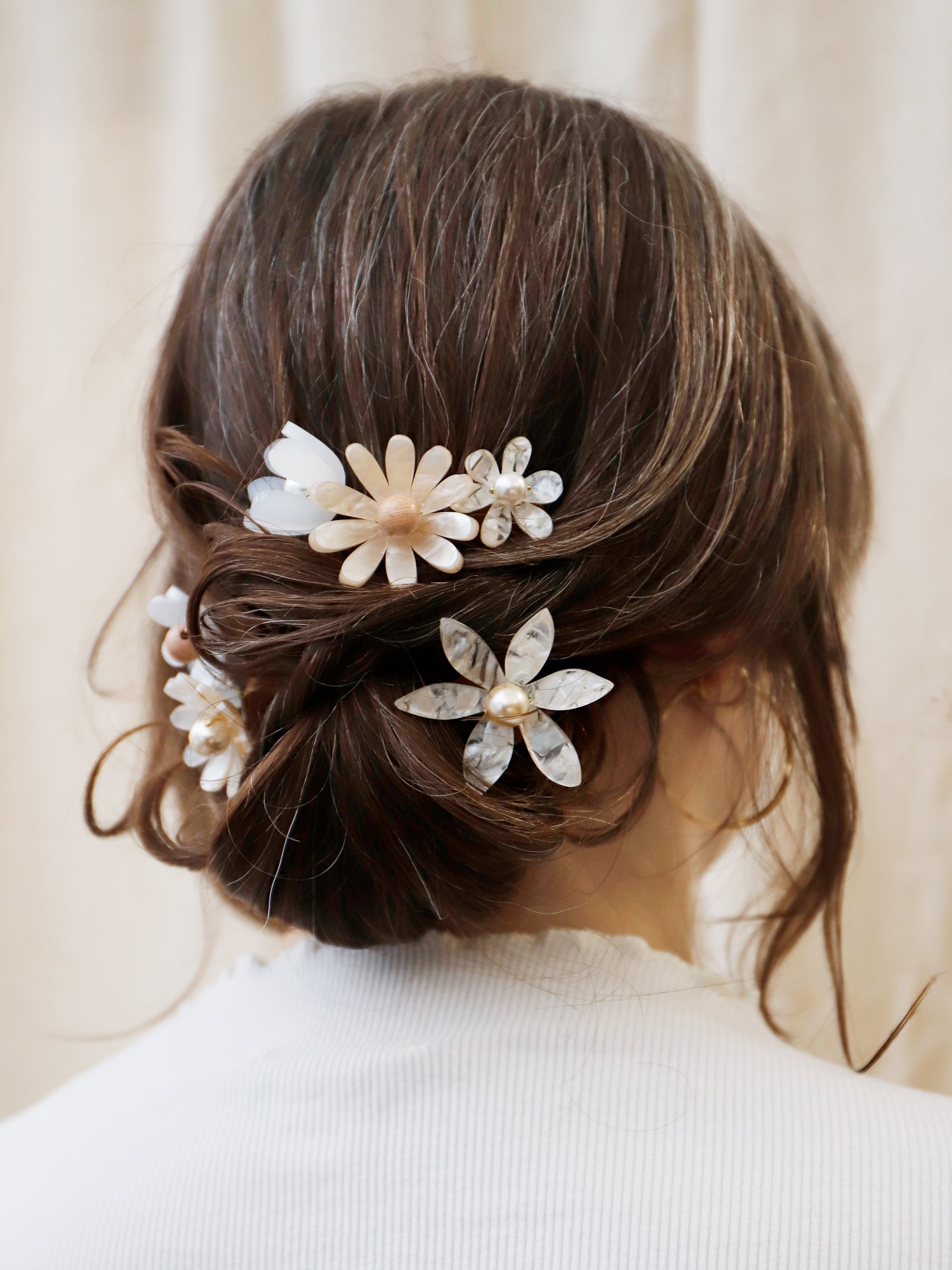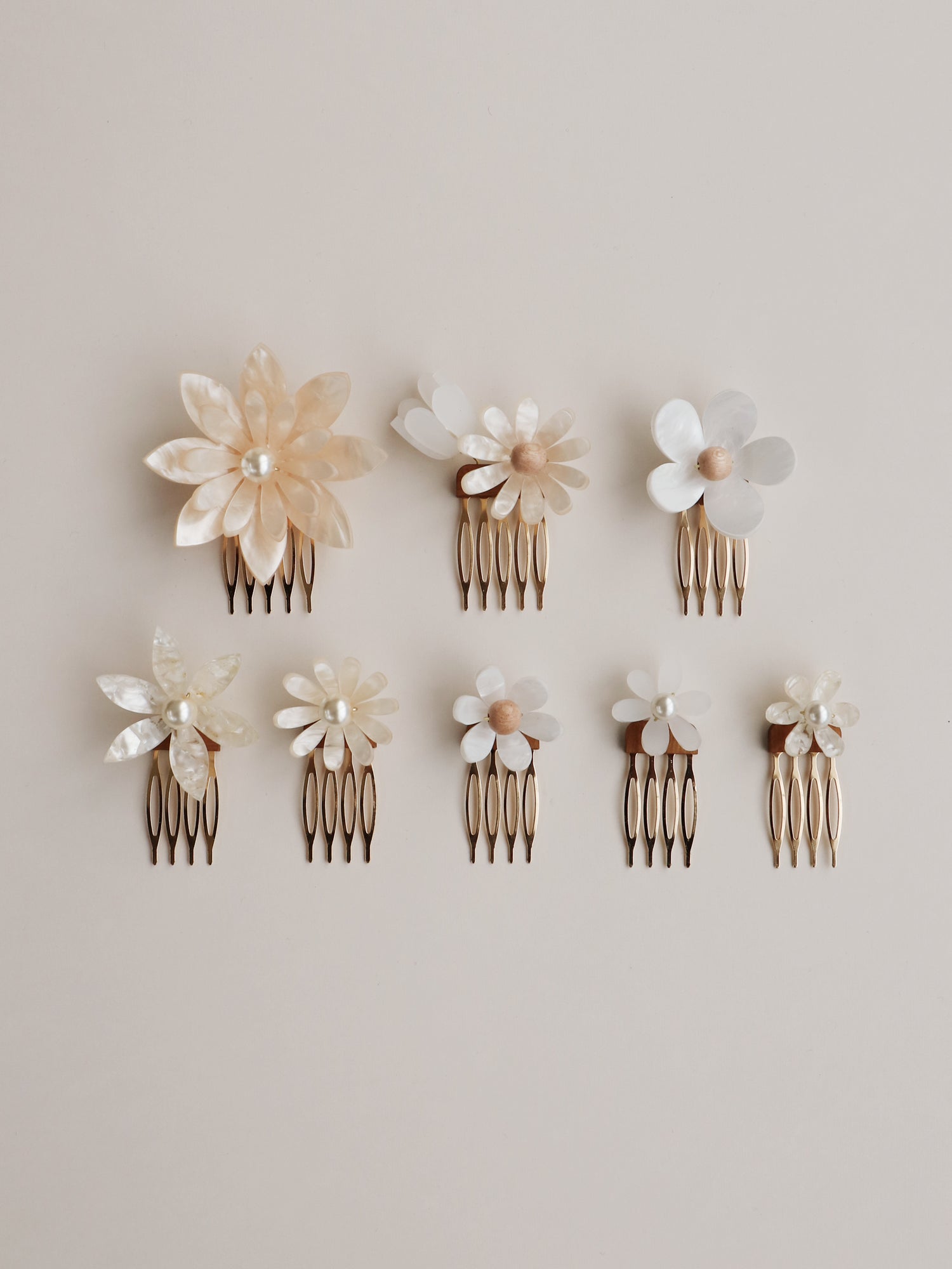 Each flower is assembled onto a small wire attached to the combs. This wire allows you to move the flower around to a position that works best in your hairstyle - clever!