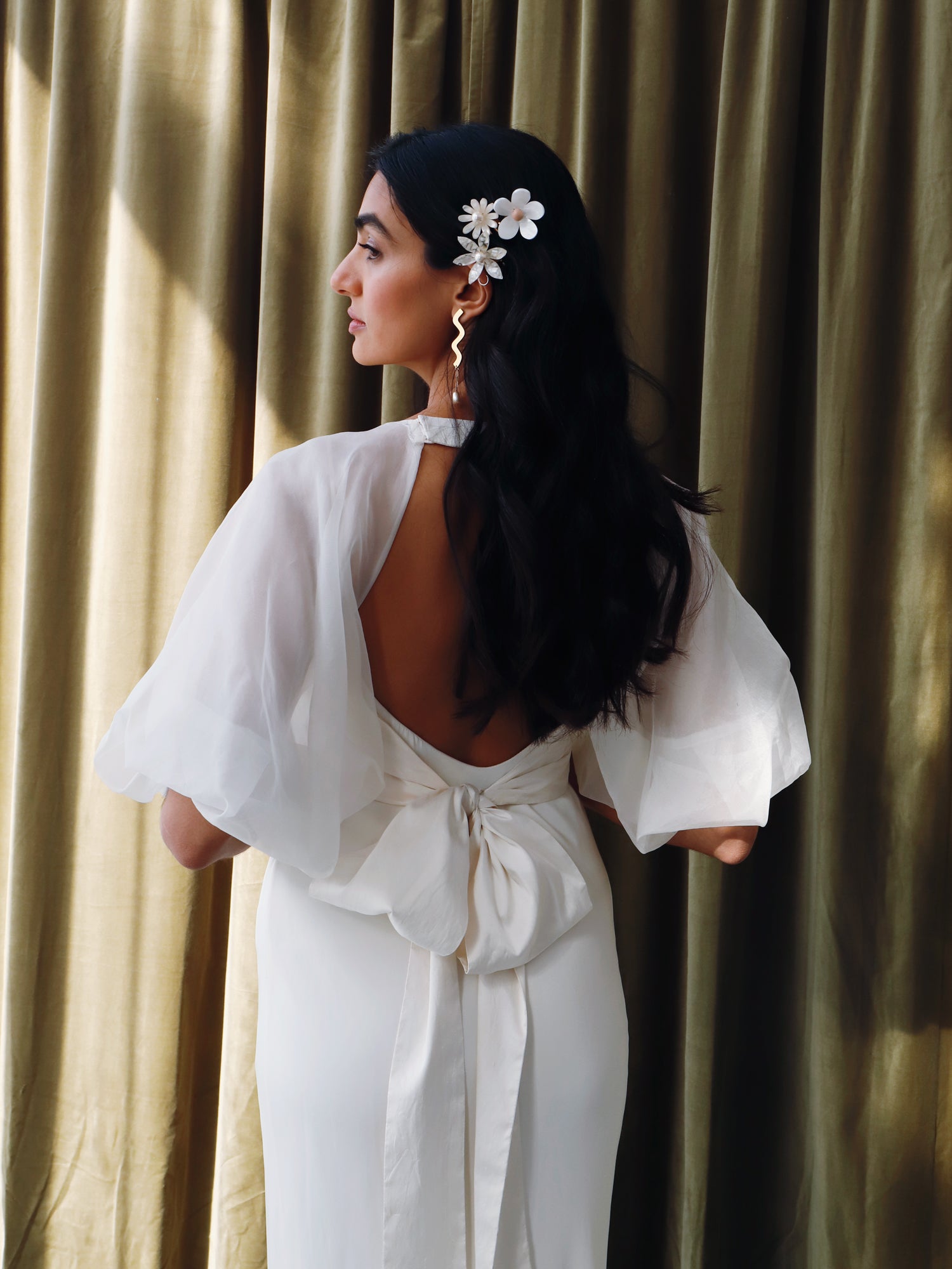 Model wears flowers on gold-tone combs.