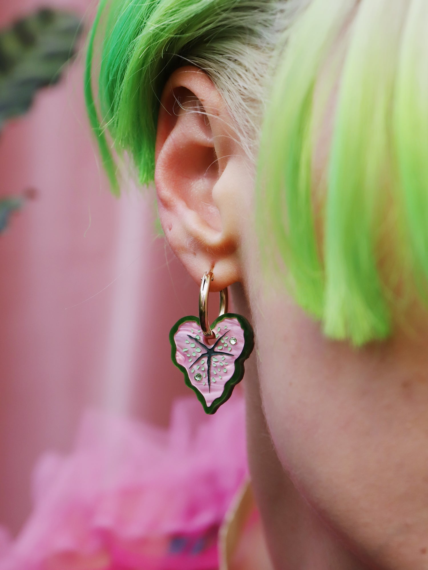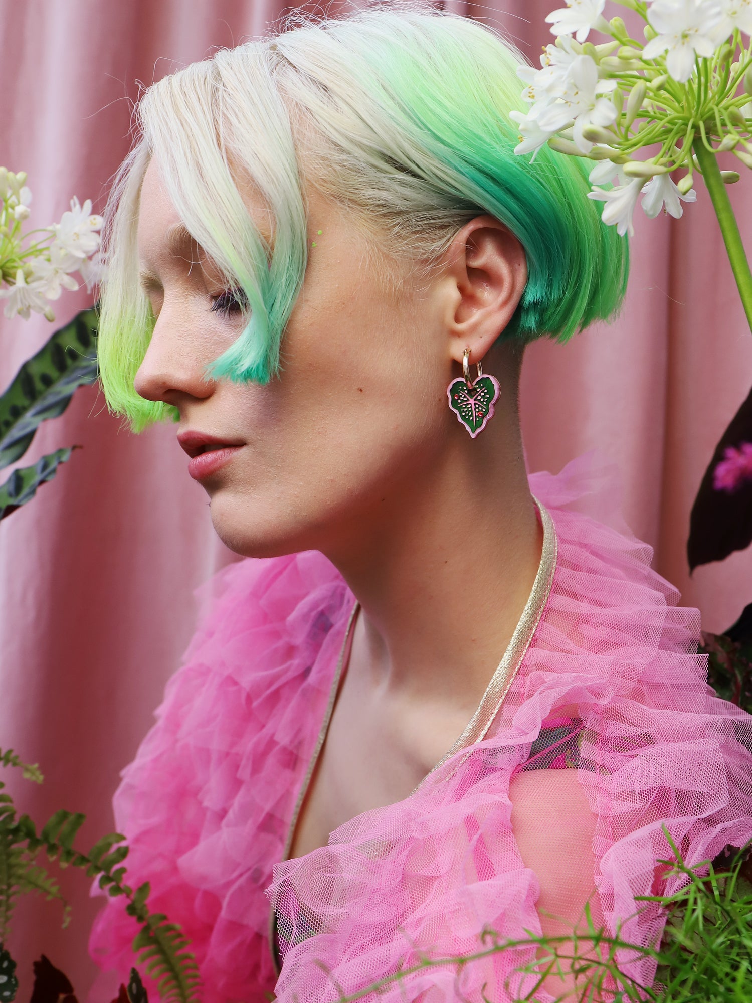 The collection was inspired by the heart-shaped caladium leaves featured in L.O.M’s vibrant new print, Cala Elysium.