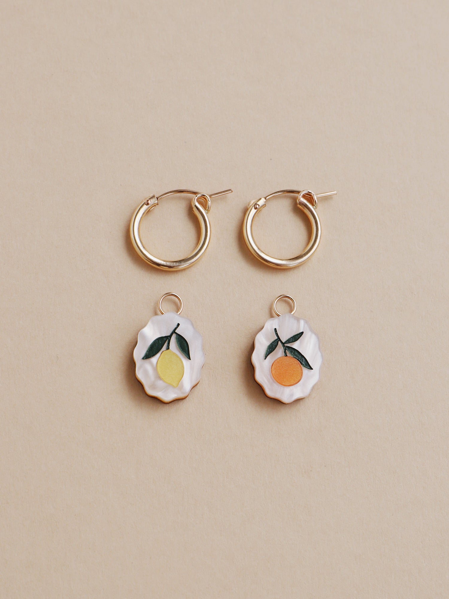 The perfect everyday essential, our citrus charm hoop earrings are lightweight and easy to wear. Inspired by vintage fruit stickers and Mediterranean tiles.