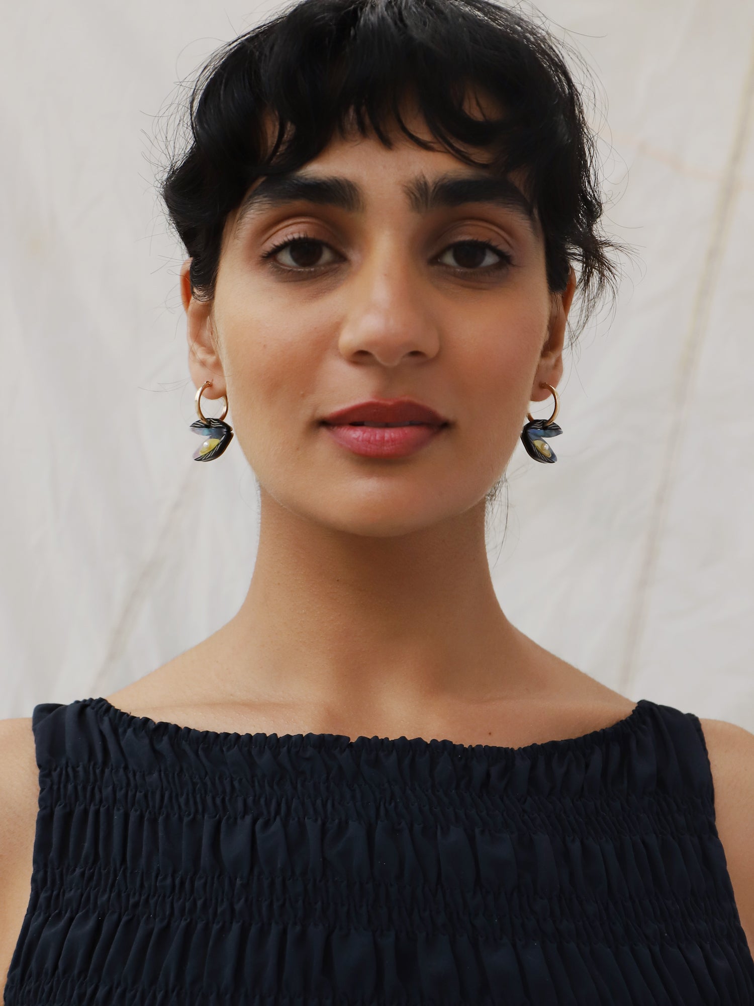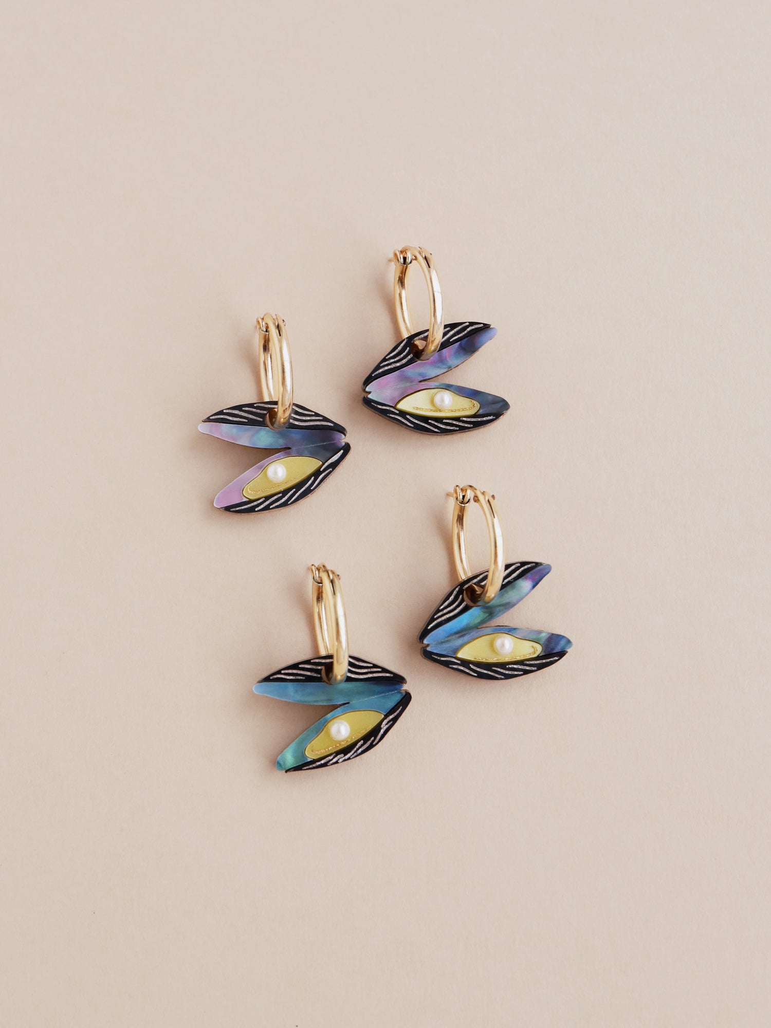 Our lightweight mussel hoop earrings are made with marbled acrylic and high quality glass pearl details, perfect for ocean lovers!