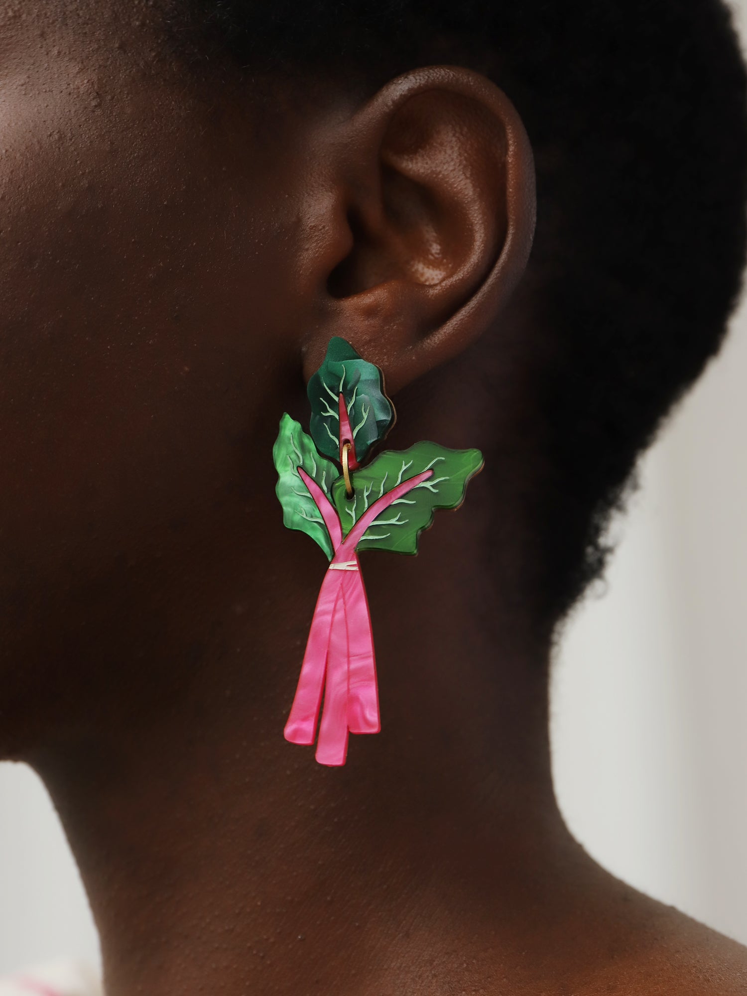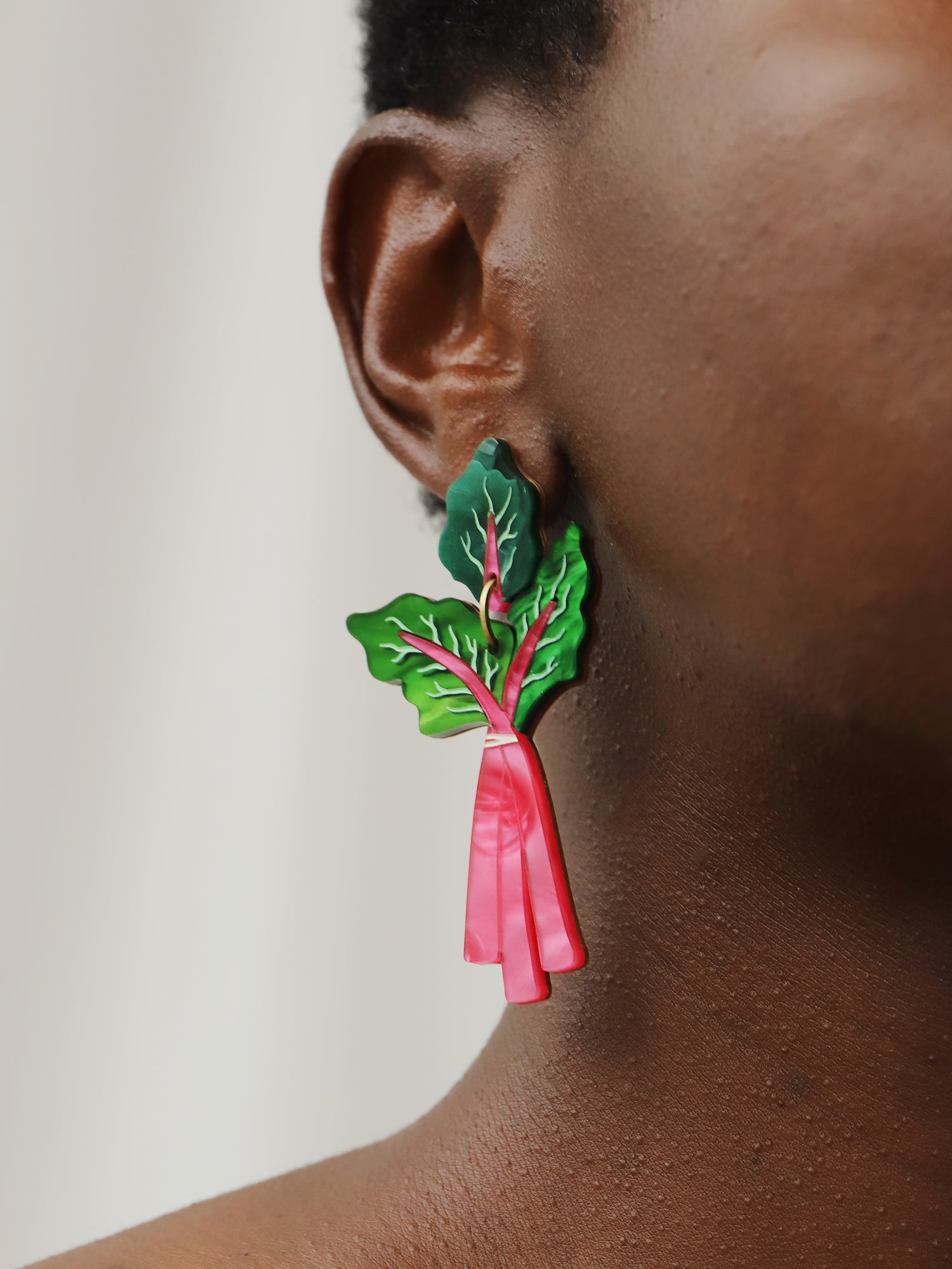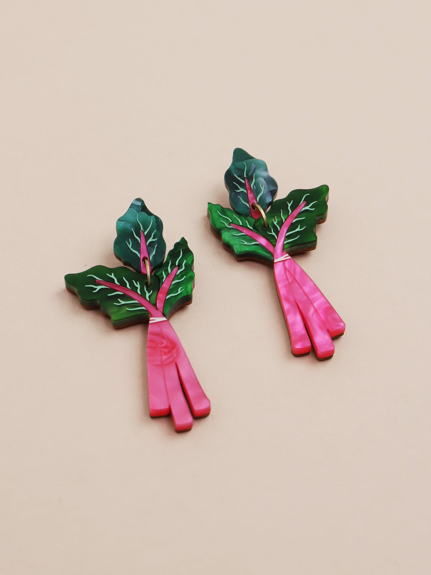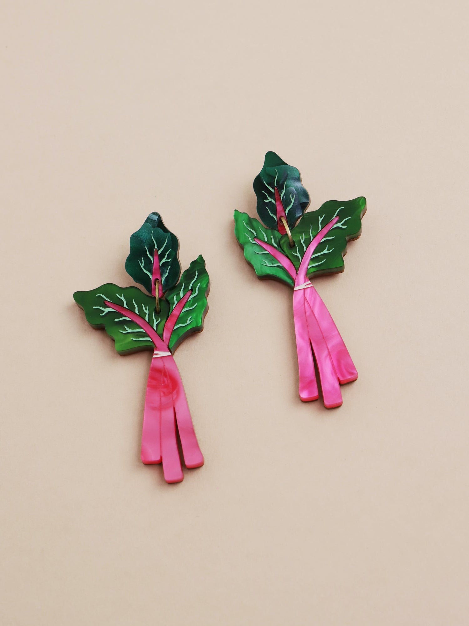 Make a statement with our lightweight rhubarb earrings made from acrylic with hand-inked details.