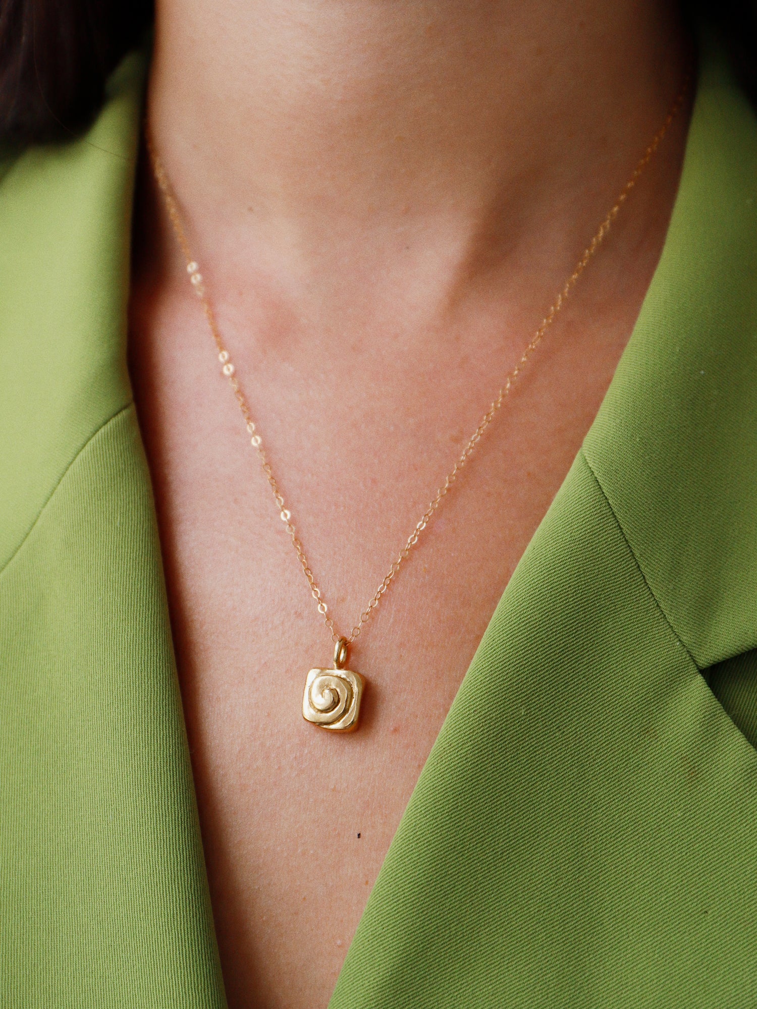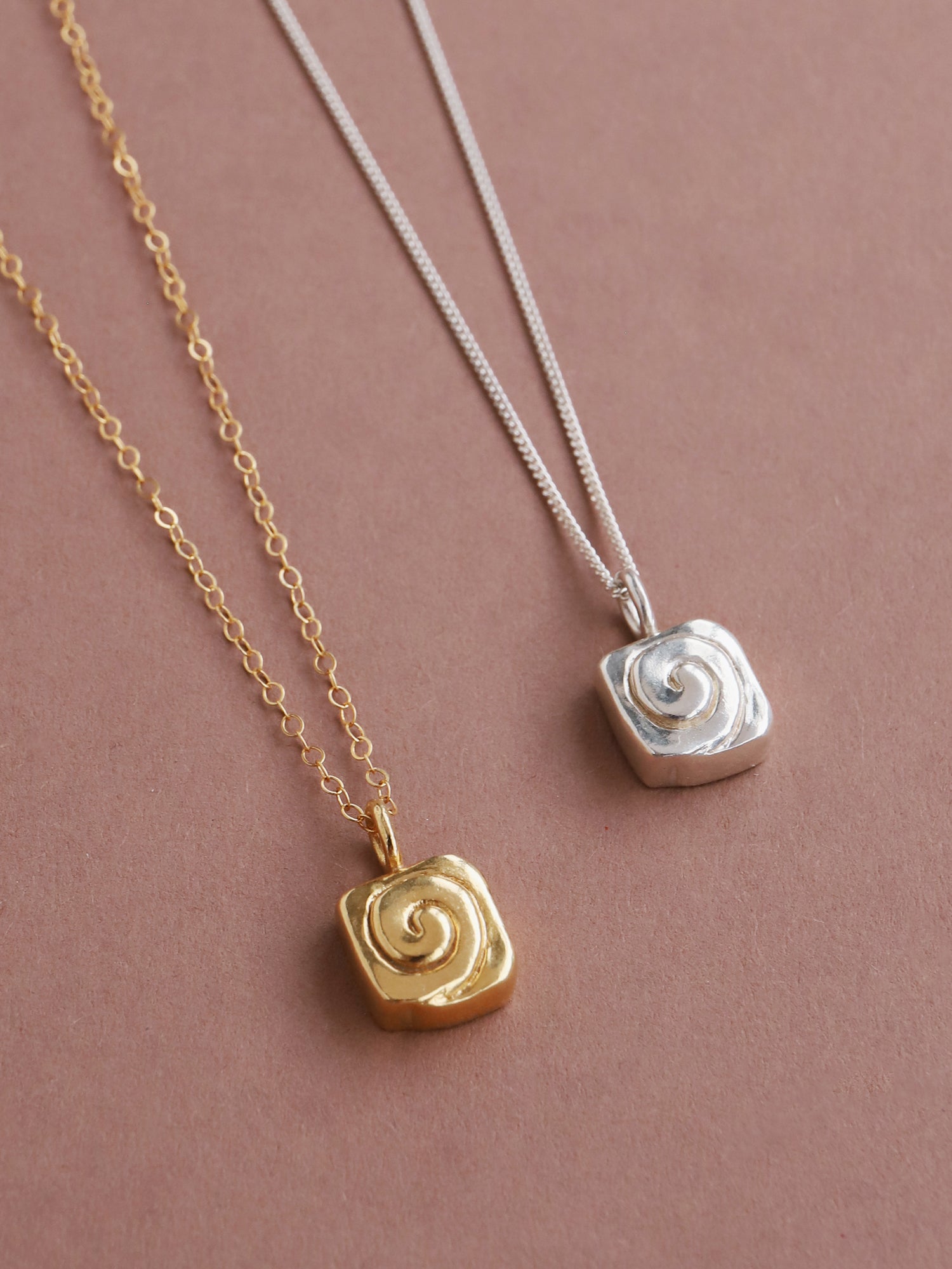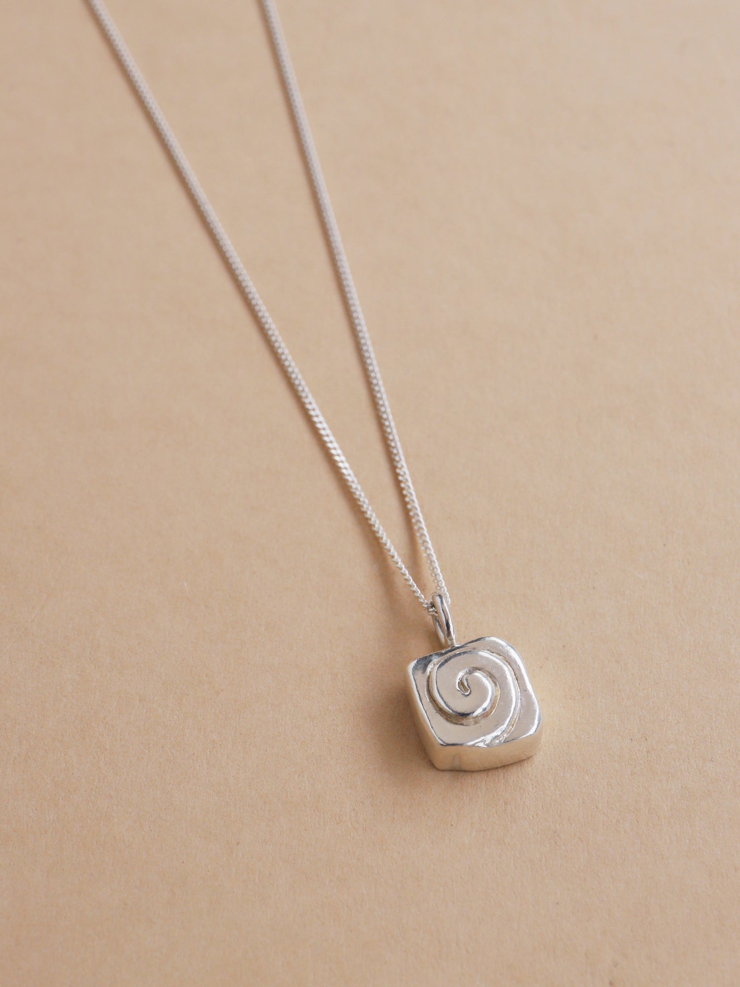 Hannah designed and hand-carved the cinnamon bun pendant initially in wax. Each piece is then cast from a mould into recycled sterling silver using the the ancient technique of lost wax casting.