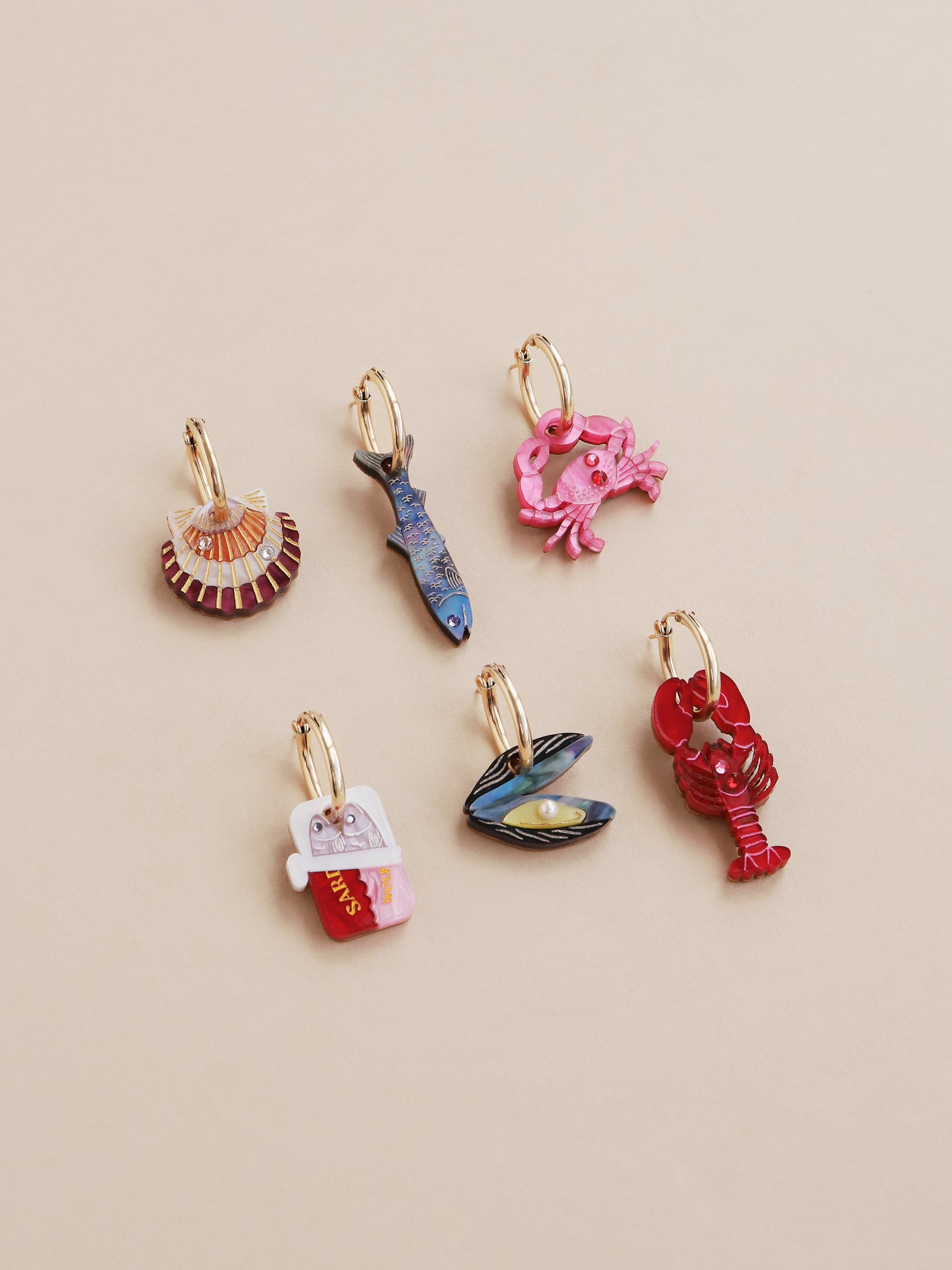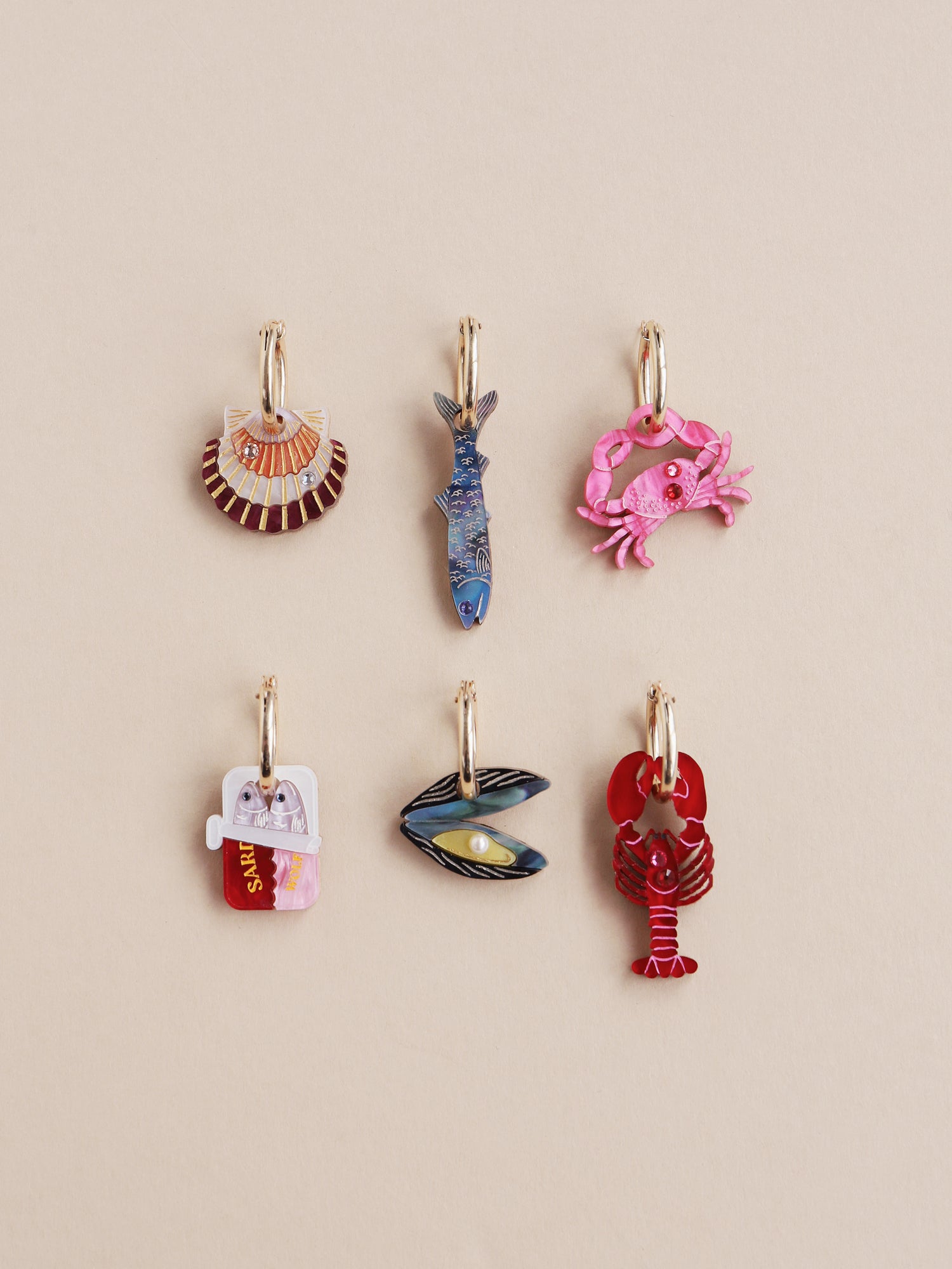 1 x sardine charm, 1 x anchovy charm, 1 x scallop shell charm, 1 x lobster charm, 1 x crab charm & 1 x mussel charm.