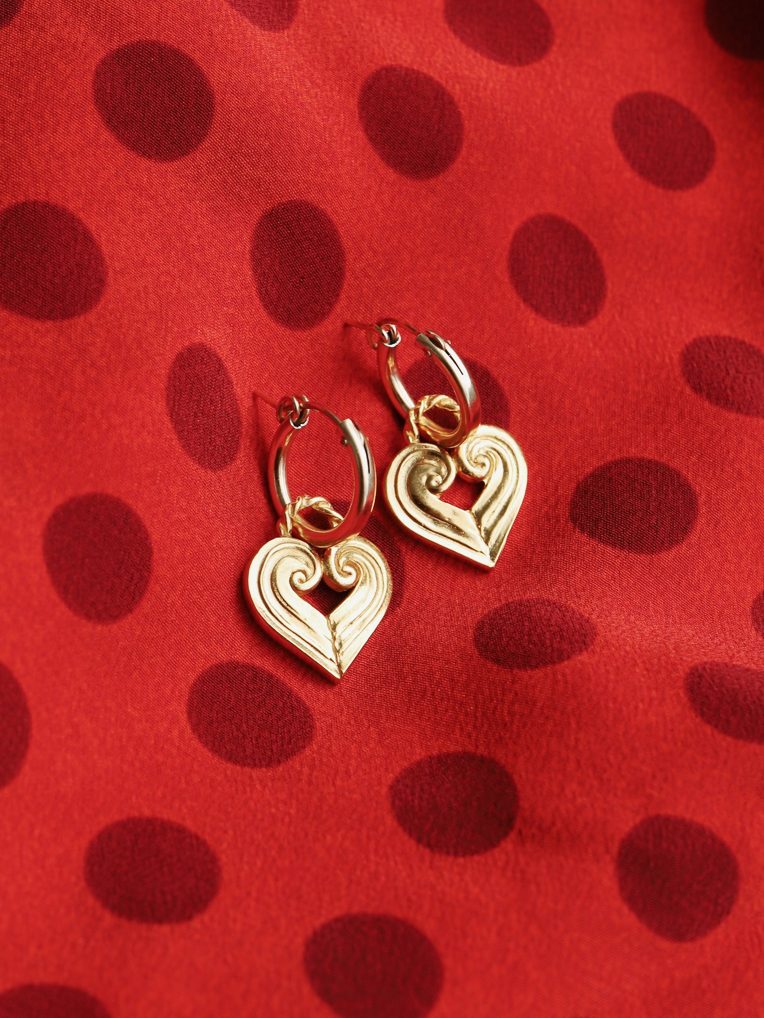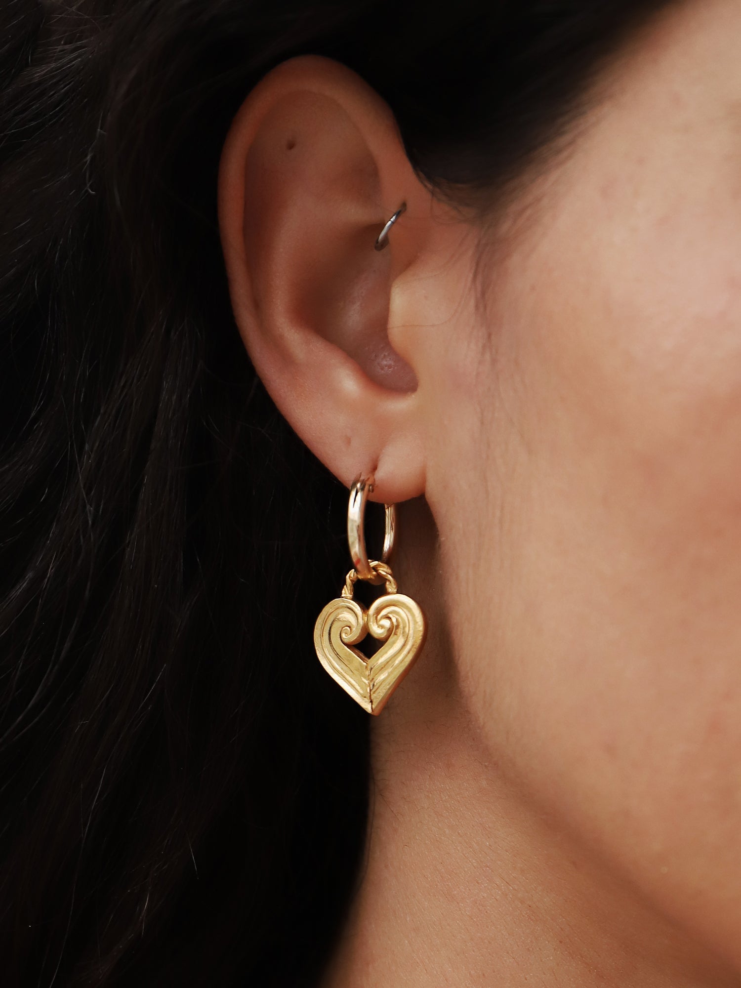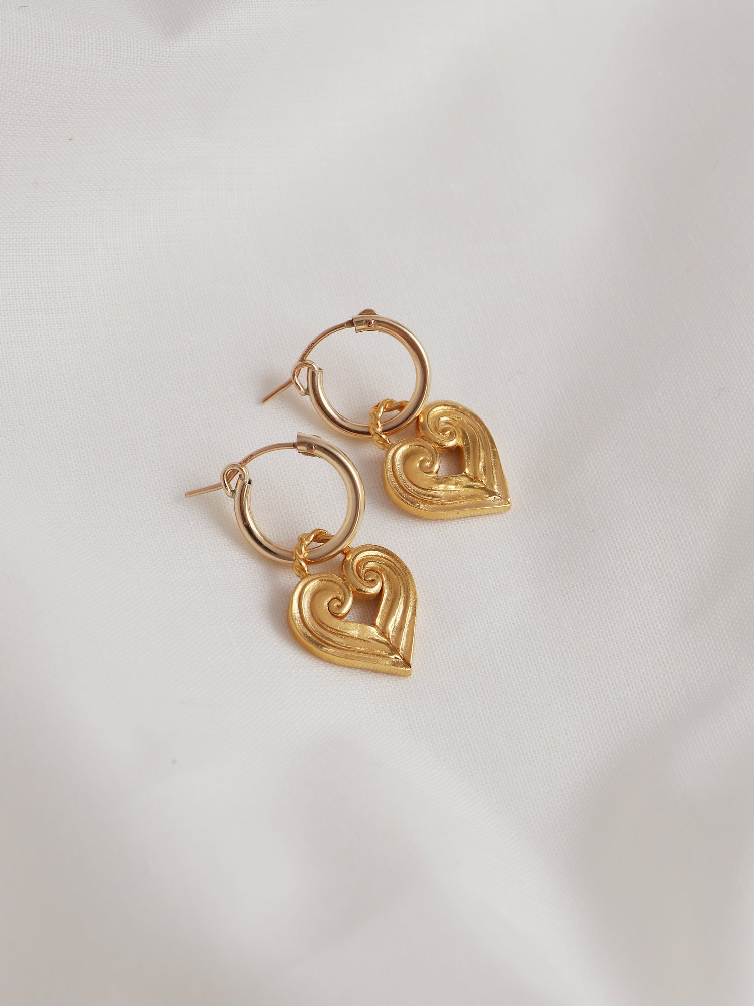 The textured heart charms hang from comfortable gold-filled hoops that are perfect for everyday wear. Charms are removable and can be purchased without hoops to add to a pair you already own. Hoops can also be worn separately.