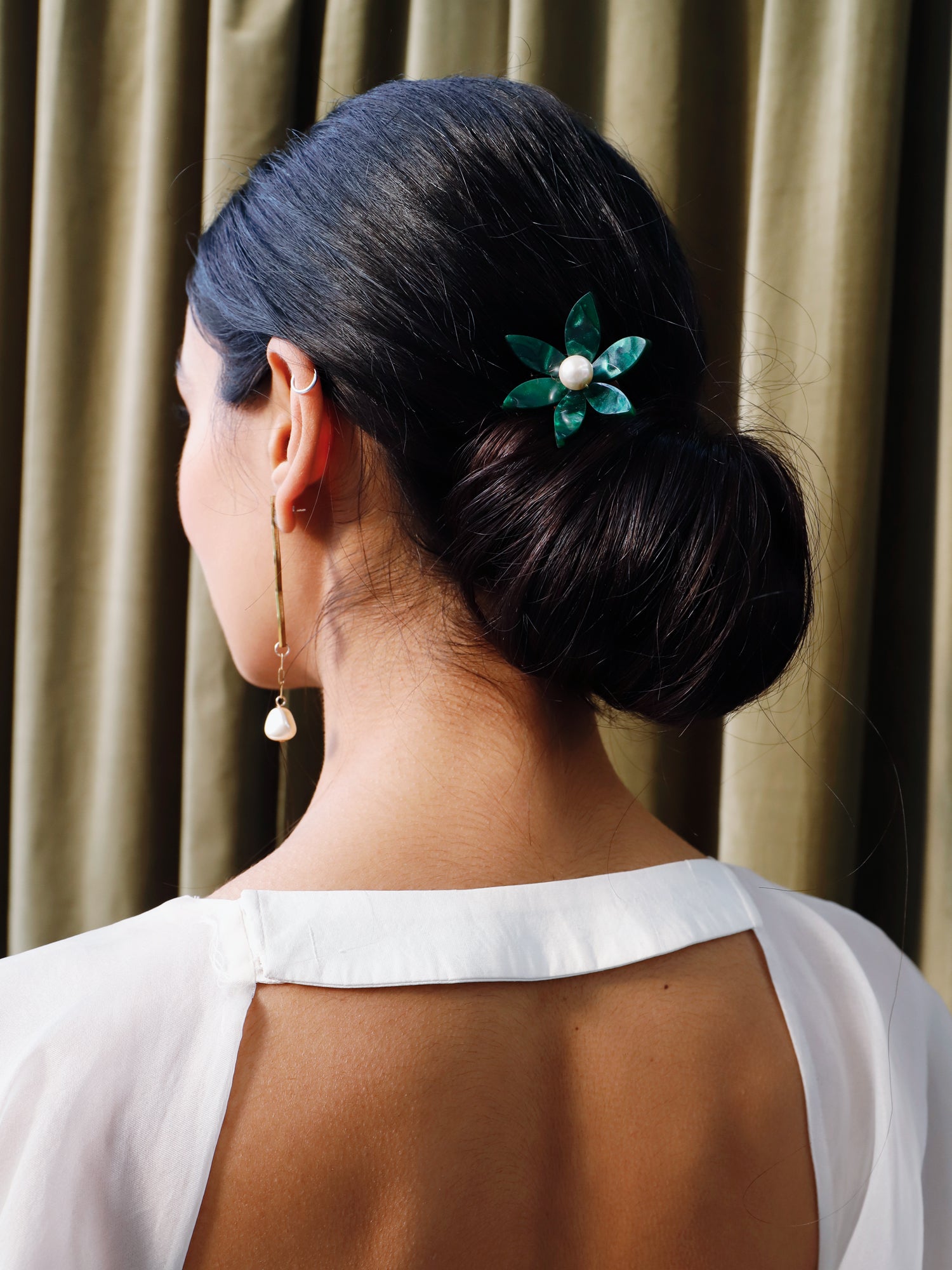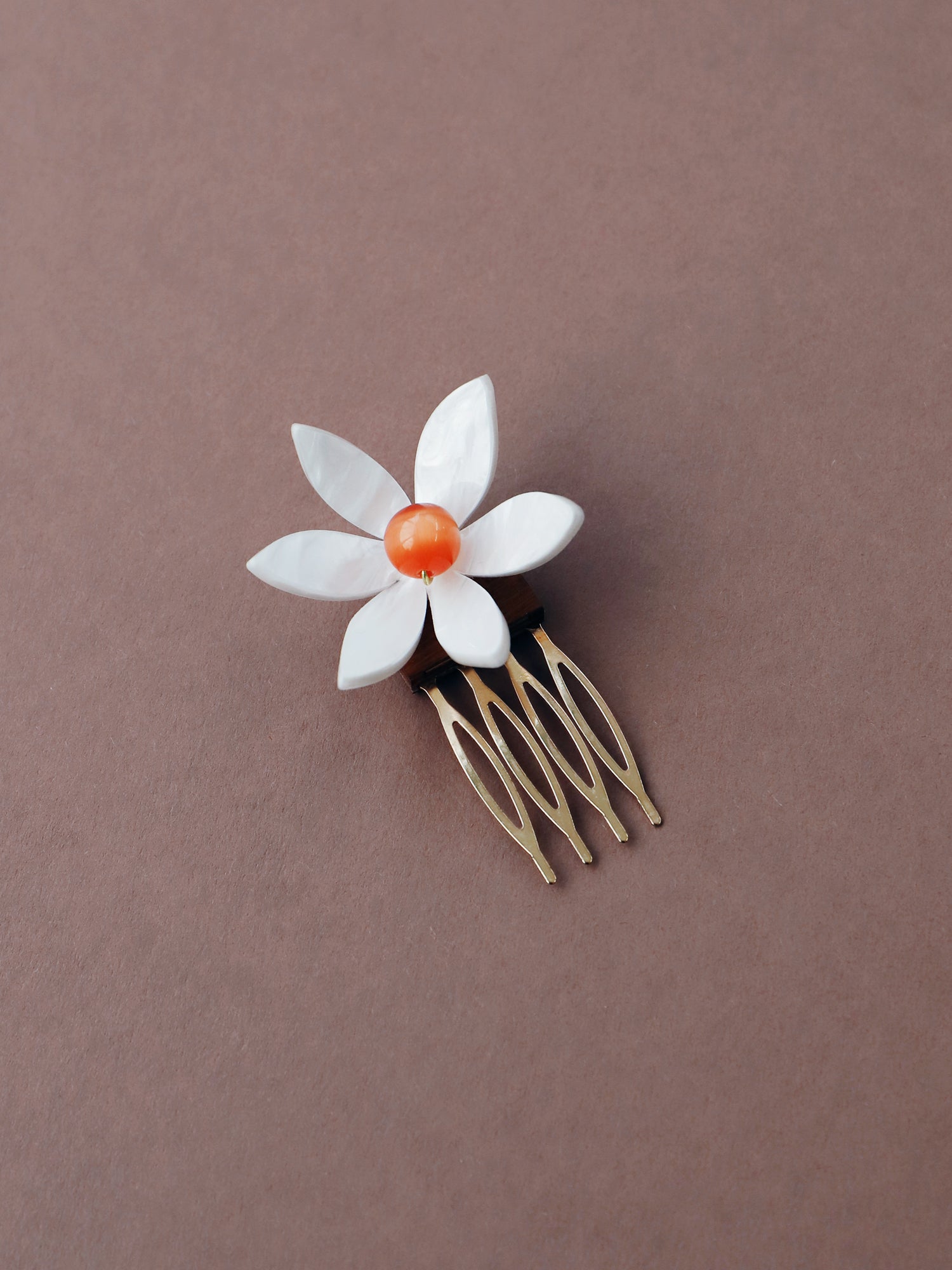Each flower is made from hand-formed acrylic and is assembled onto a small wire attached to the combs. This wire allows you to move the flower around to a position that works best in your hairstyle - clever!