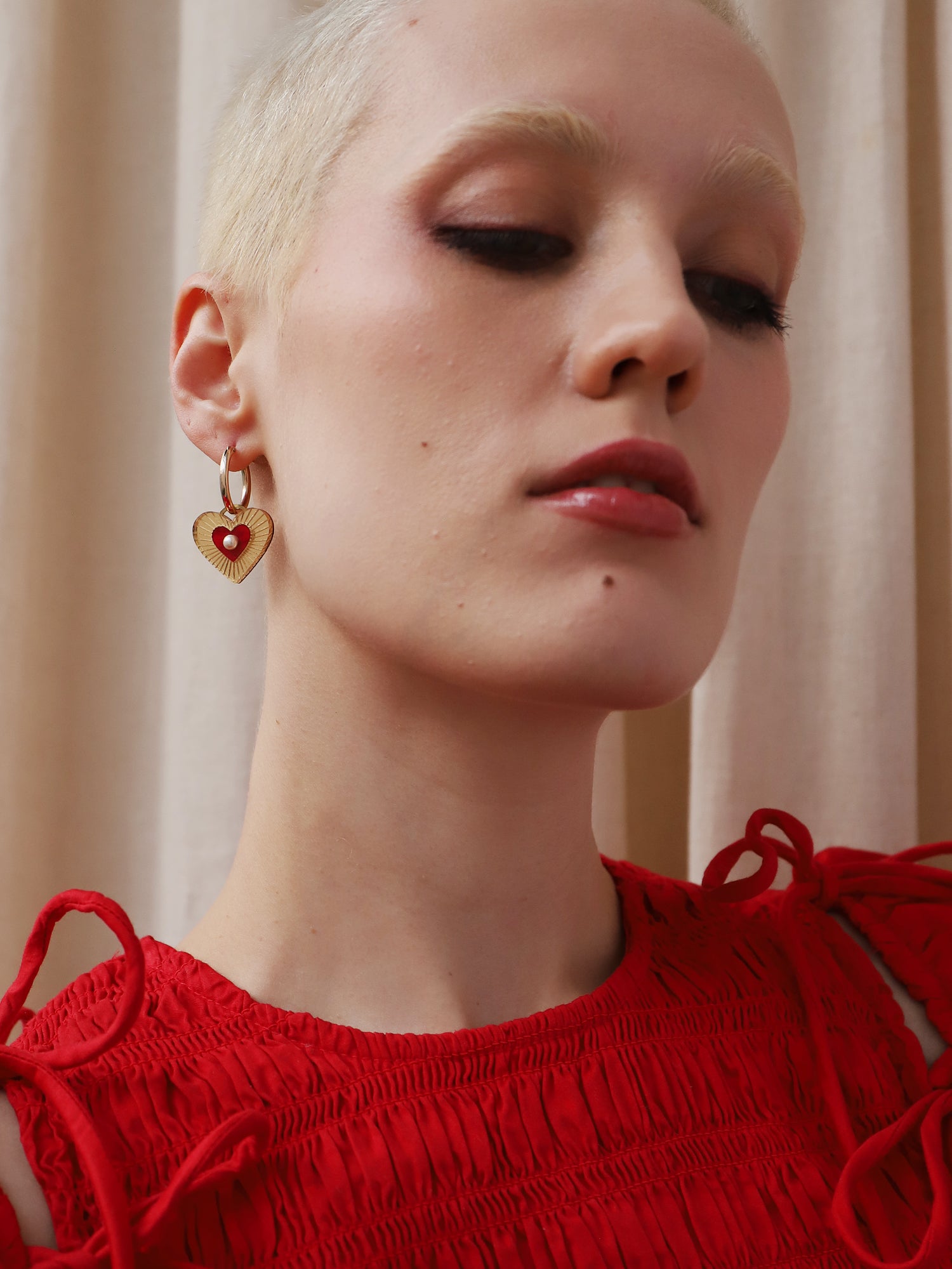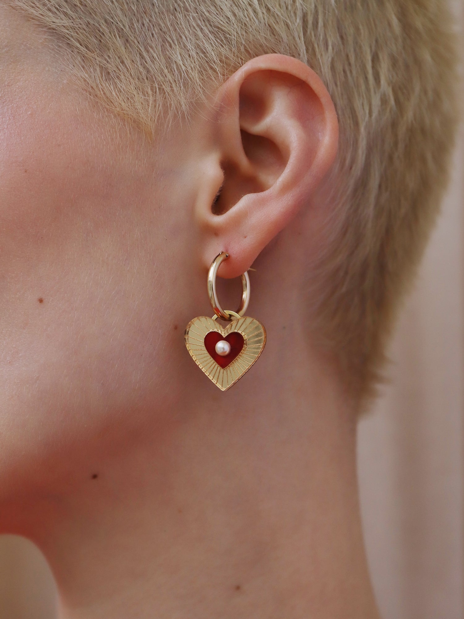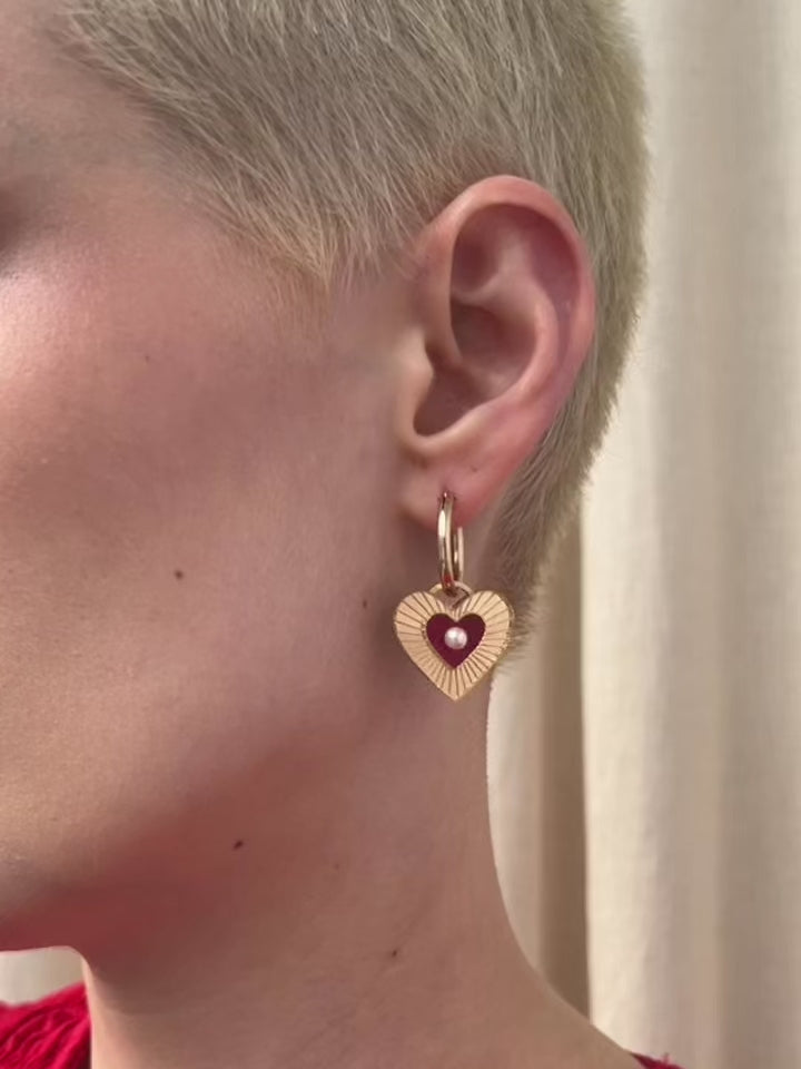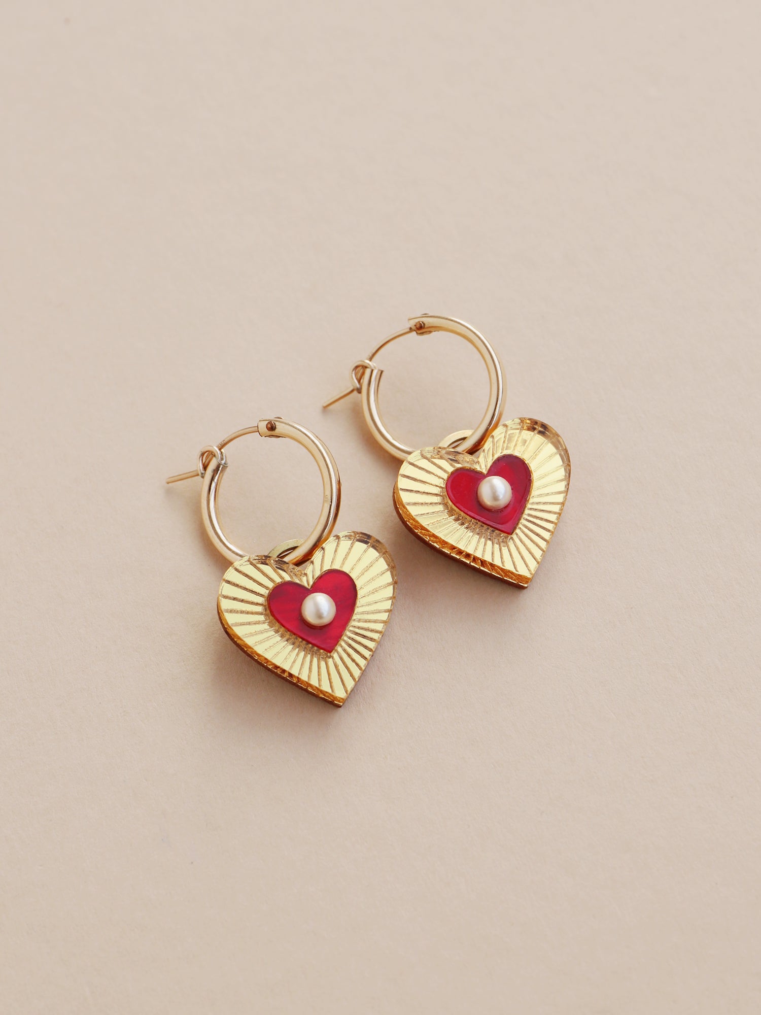 A little piece of love you can wear every day! Our lightweight heart-shaped hoop earrings are made using Signature wooden backing and shimmering acrylic with high quality glass pearl details.