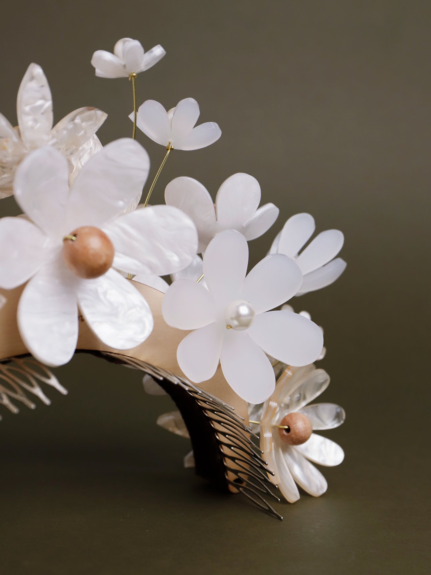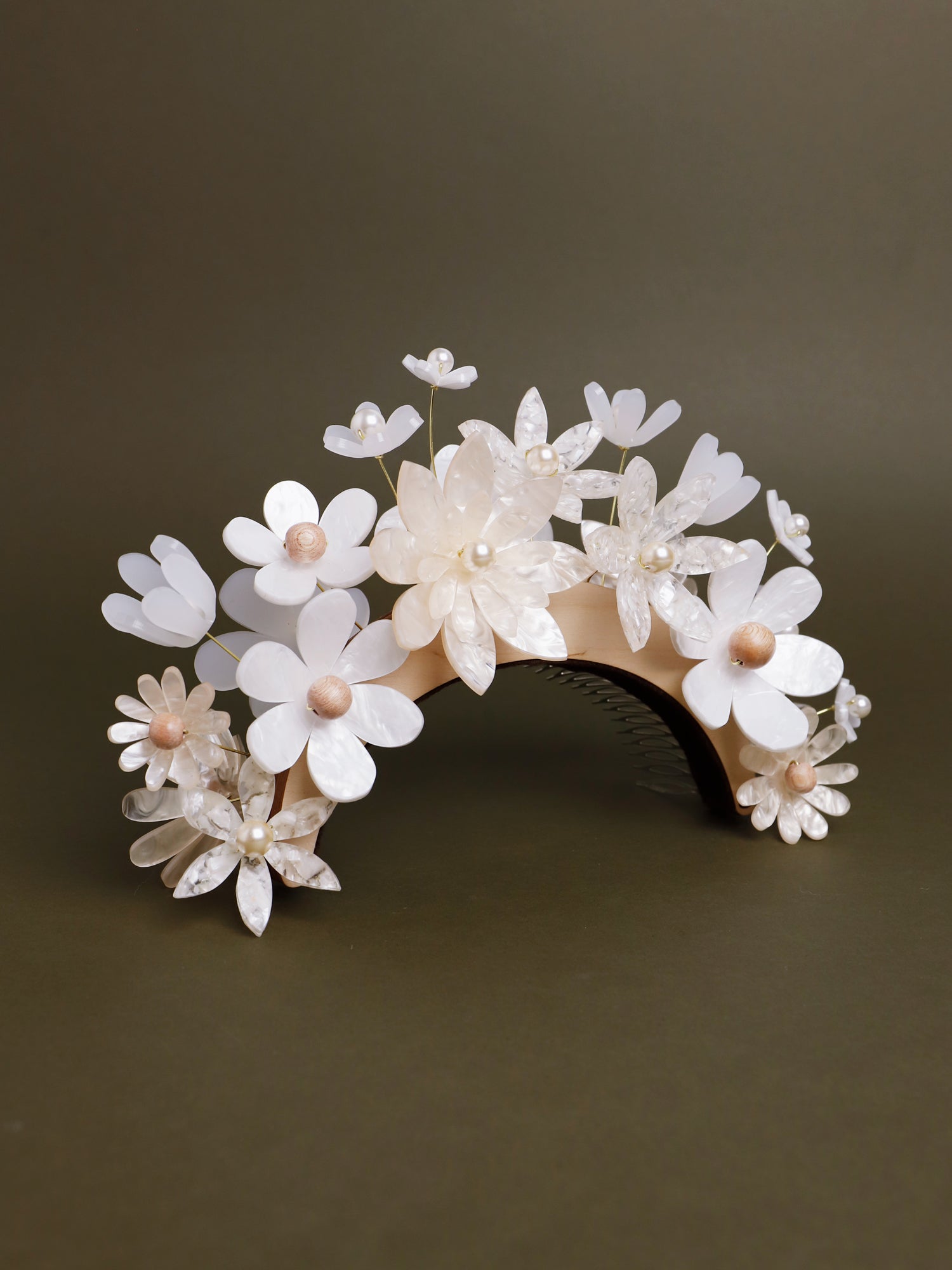 The headpiece is secured in your hair by large adjustable combs around the wooden band.